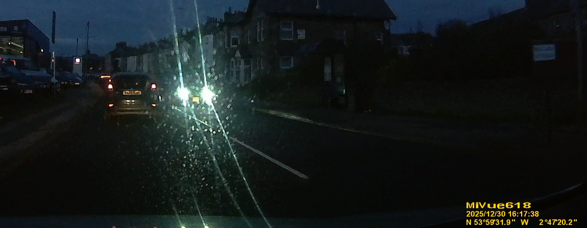 Seat Leon. Approaches with headlights stupidly bright. Check the number plate because when you see overly bright headlights & then the brightest number plate lights you've ever seen then it often means something else isn't legal.