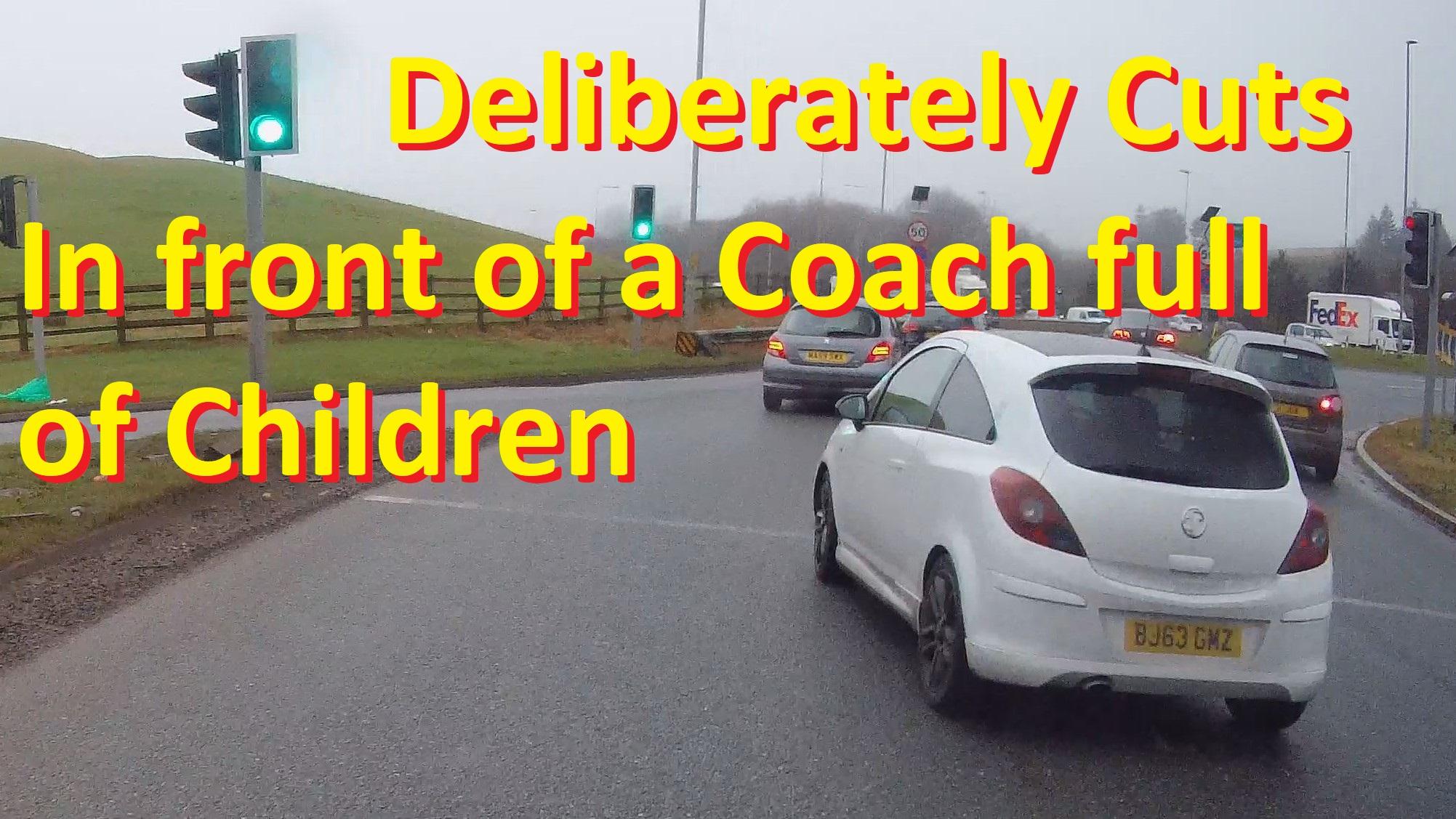This idiot was in the wrong lane and thought the coach had cut him off. So he decided to cut the Coach off at the traffic lights and then block it from overtaking.