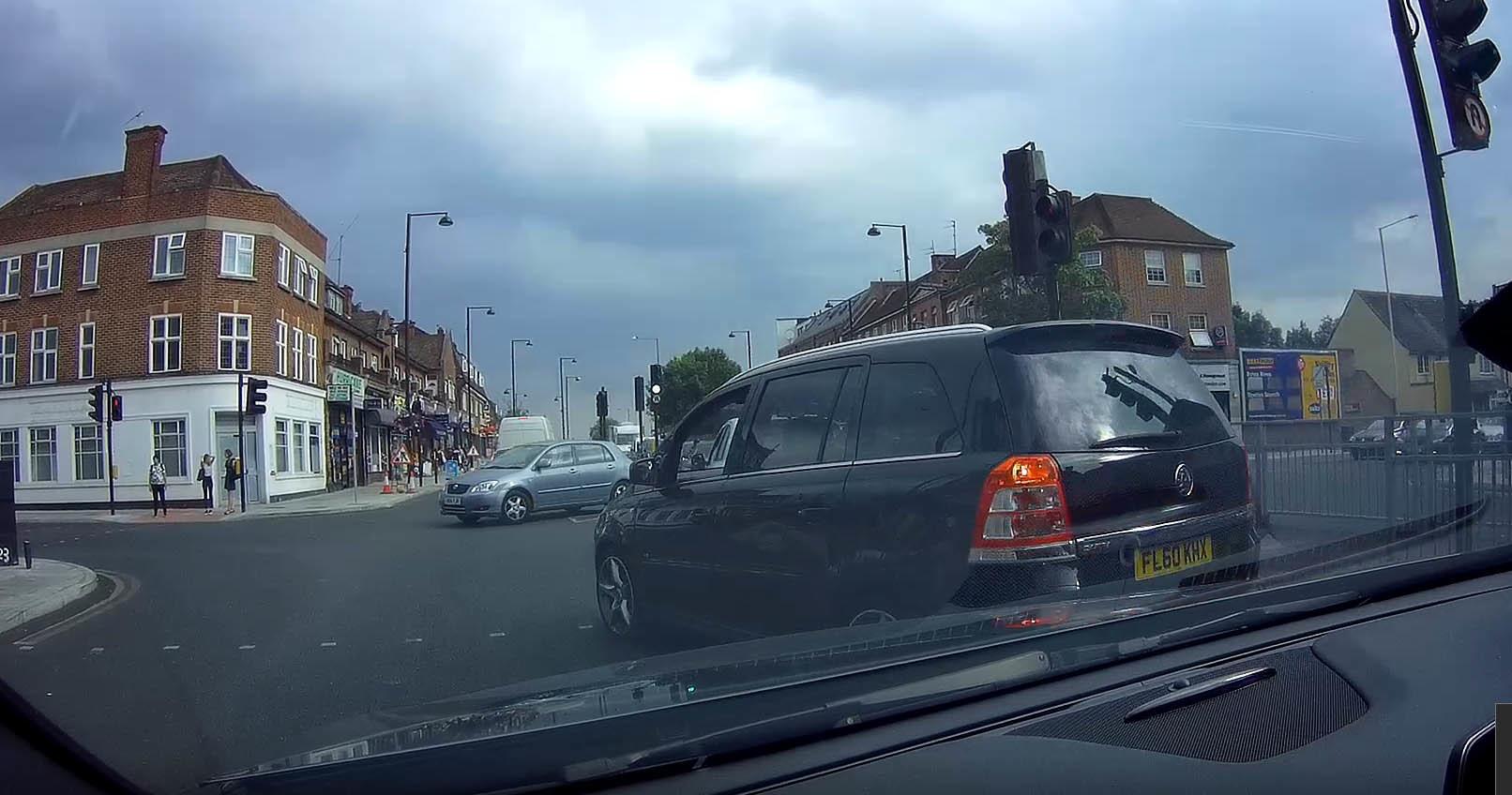 Uses the right turn only lane to queue jump writing traffic at lights. Enters a junction where the exit is blocked and almost collects traffic turning across.