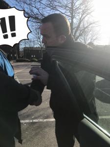 Cut off another driver before the incident, then proceeded to drive very close to my bumper in an intimidating way. Overtook me on the wrong side of the road around a traffic island, I honked my horn as it was very dangerous and he sharply stopped and I nearly hit him. He proceeded to get out and threaten me. By this time a member of the public came out and told us he was in the wrong. He took a picture of my number plate too (I don’t know why). He seemed to be drunk or on drugs by the way he got out of the car. Total idiot, dangerous driver and complete p***k!