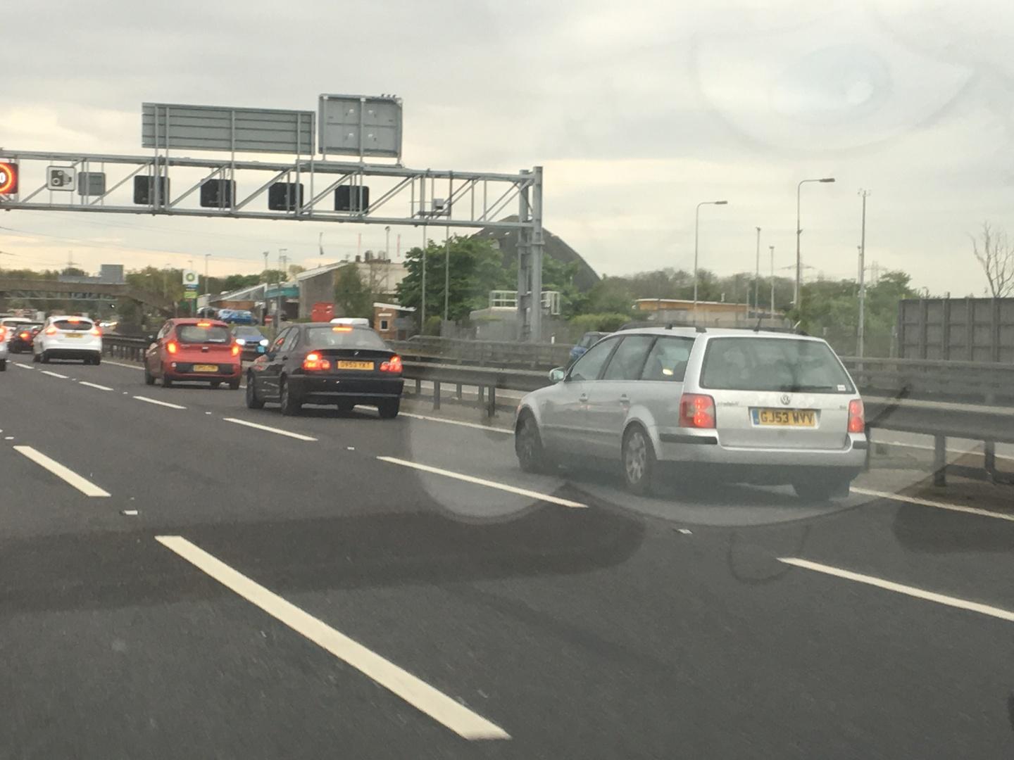 M1 junction 12 Utter muppets speeding, swerving in and out dangerously close to other cars at high speed racing each other. Traveling with fellow silver vw passat estate. 2 dirty foreign men.