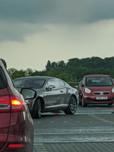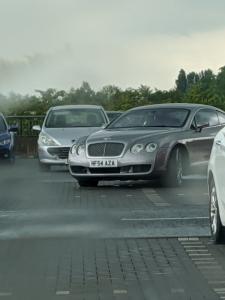 Bentley parked in the car park taking up two parking spaces and half of the road. It must've been there a while, there are traffic cones around the vehicle.