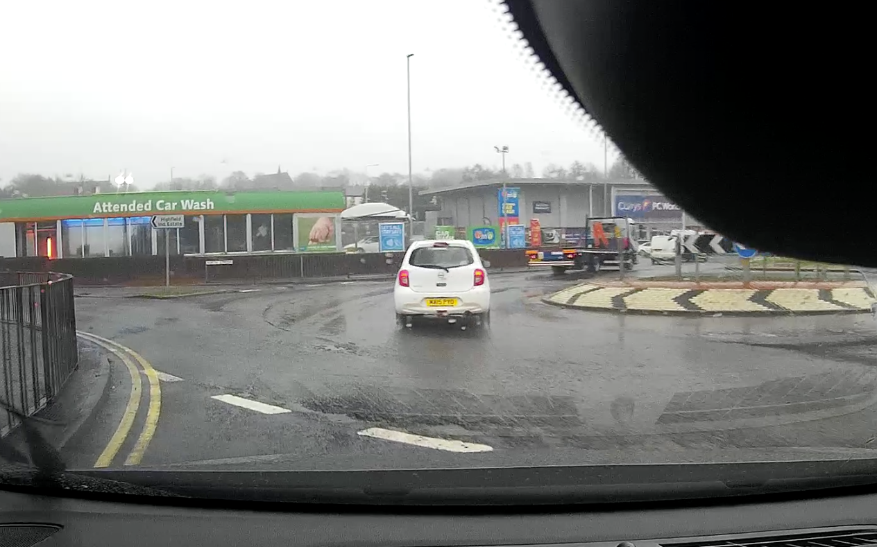 This driver is unsafe, no lane discipline wandering from one lane to another, then in between the 2 lanes, cuts across roundabouts in front of other cars, complete disregard for other drivers, total idiot or drunk!