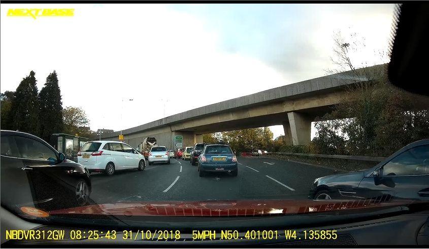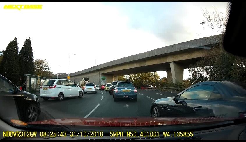 This total idiot used the gap I left for stopping distance to cut in from the wrong lane. Only just missed the front of my car and was so close and moved so fast that the collision avoidance kicked in. Look at the angle he took. Also nearly collided with the car on my left.