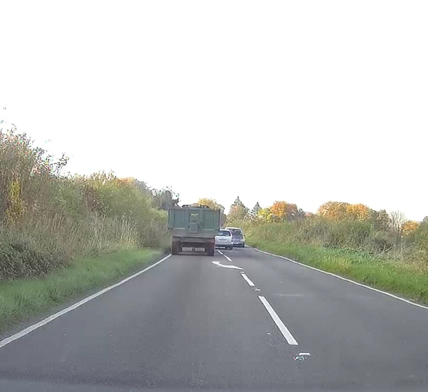In a line of traffic behind a slow moving farm vehicle. All but one car in front of me managed to overtake. I pulled out to get a better view and see if an overtake was possible. I saw the car coming the other way so pulled back in. The Vauxhall estate in front of me had now pulled up behind the vehicle. He pulled out blind, must have seen the incoming car but continued anyway. If the other car had not emergency braked it would have been a head on collision. I'm not sure if they did make contact but the driver looked pissed off, made a quick three point turn and went after him. No sign of either car further down the road.