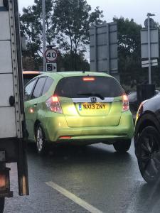 Someone please get this mongoloid off the road ASAP. Tried to overtake and had to stop because their was a car coming towards him. Pushed his way through then very very slowly overtook me and then stopped dead in the middle of the road.