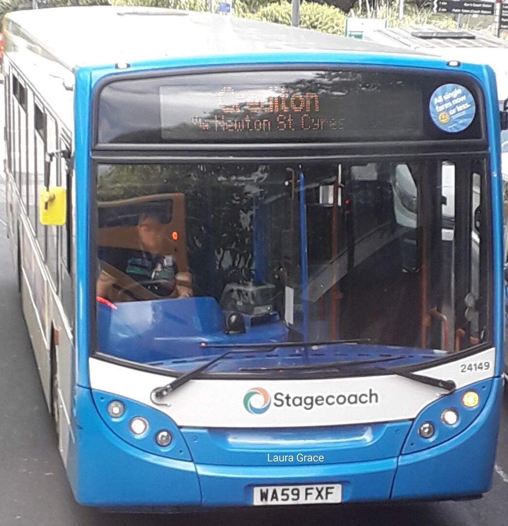 Stagecoach Devon's 24149 'Laura Grace' (WA59 FXF), an Alexander Dennis Natalia Pearl XS-bodied MAN 18.240LF on route 5B to Crediton from Exeter bus station. This bus is taken from the top deck of 15256 (YN65 XDV) 'Emily Paige', a double-deck Scania N230UD ADL Natalia Pearl. The 'Laura Grace' name is also the name of double-deck integral ADL Rose 10693 (SN66 VVD) (which is named 'Grace Laura') (for more info see Rate Driver page of SN66 VVD) but reversed for 24149, it is randomly chosen.