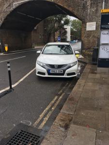 Parks on zigzags by crossing outside shops. Too lazy to park properly as there was plenty of space to park legally.